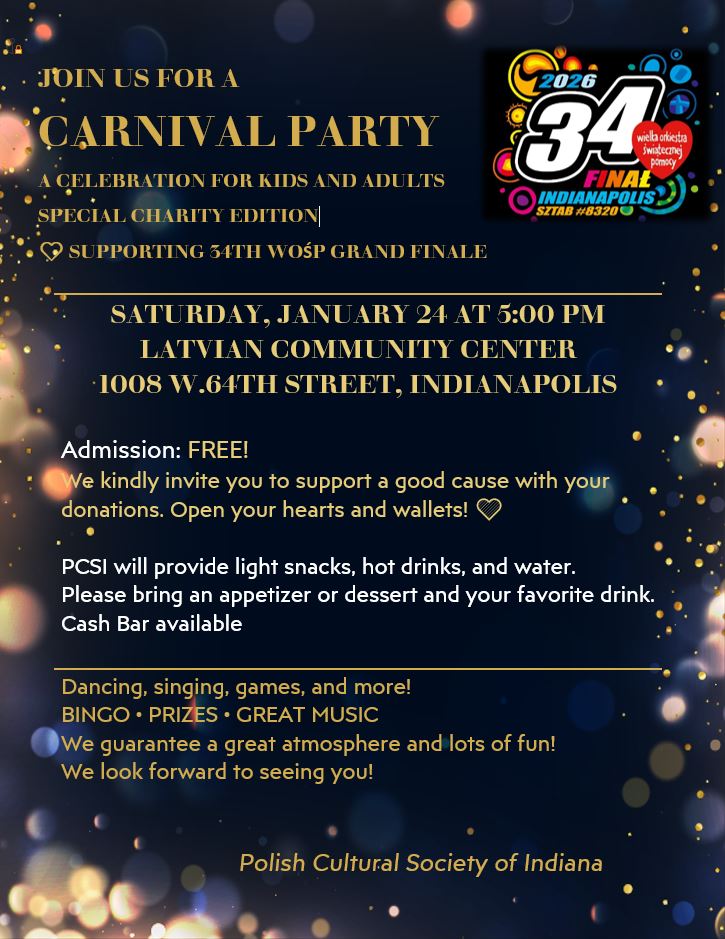 Jak co roku Polish Cultural Society of Indiana (PCSI) zaprasza za zabawę karnawałową 24.Stycznia 2026. Wstęp na zabawę jest bezpłatny i warto nas odwiedzić ponieważ w tym roku po raz